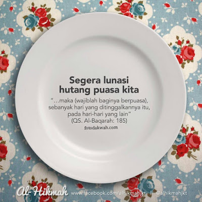 Sesuai dengan judul tulisan ini, sudahkah kita membayar hutang puasa? Bagi akhwat-akhwat khususnya, sebagian besar pasti memiliki hutang puasa ramadhan tahun kemarin. Tapi yang jadi pertanyaan sekarang, sudah di ganti kah? Sudah lunaskah? Begitu banyak waktu yang disediakan bagi kita untuk melunasi hutang-hutang puasa tersebut, tapi sudahkah kita manfaatkan waktu sebaik mungkin? Melunasi hutang puasa, tentunya lebih cepat lebih baik. Sebelum ramadhan tiba, bagi yang belum membayar hutang puasa, yuk dilunasi.
